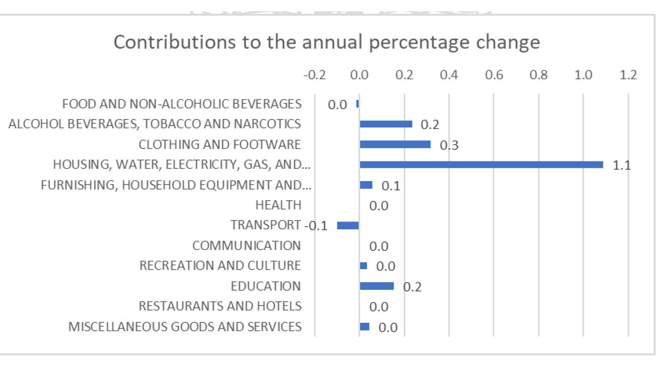 Food and non-alcoholic beverages recorded a slight annual decline of -0.1 per cent, while transport costs fell by -0.6 per cent year-on-year.