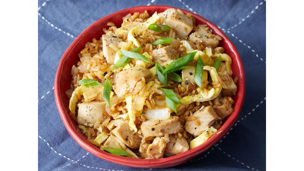 - Heat oil in the same skillet. Add onion; cook and stir until soft, about 3 minutes. Stir in rice, chicken, soy sauce, and pepper. Cook and stir for about 5 minutes; stir in shredded egg. Serve hot.